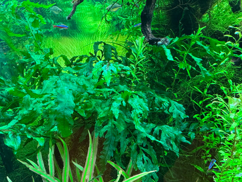 Bolbitis heudeloti originates from West Africa, it is a beautiful fern given optimal condition with CO2, the translucent leaves produce a lot of oxygen bubbles that gather underneath the leaves and create a stunning view. It is widely used in Nature aquariums and it gives a very natural and tranquil forest feeling.