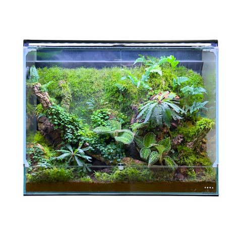 DOOA System Paluda 30 and 60 are aquarium kits designed specifically for paludarium use. They provide optimum growing conditions for tropical plants. System Paluda 60 has a double-door design, and System Paluda 30 has a single swing door. They both have a sliding glass top. Front glass doors are fully open for easy maintenance. System Paluda 30 and 60 both come with a Mistflow box. The mist generated by Mistflow comes down from the Mistflow tank, where the water is kept at a constant level by a water circulation pump, and creates humid conditions in the aquarium tank. Water gathering at the bottom of the tank over time can be removed by absorbing it with a high-absorbent sponge (included). The Mistflow box has retainer grid pins to easily mount the Wabi-Kusa Mat on the wall for background layout. By installing Circulation Fan 40 (one included) to either a fan mounting hole located at the side of the tank or on the stainless-steel mesh cover on the top, a mist can be directed downwards and generate wind, which is necessary for the growth of plants such as orchids. Power Cord S-70 (sold separately) enables you to control the lighting schedule, wind, and humidity of the paludarium and create various conditions suitable for the plants. You can also enjoy the distinctive colors of tropical plants by using RGB LED Paluda Light 30 and 60 (sold separately) with this product.